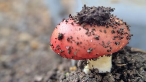 お店の玄関の横のすみっこに、いました。見るからに毒々しい色のきのこ、スーパーマリオでパワーアップ出来るアレ(ベニテングタケ)に似ていますが、これは「ドクベニダケ」です⚠️パワーアップはできません。