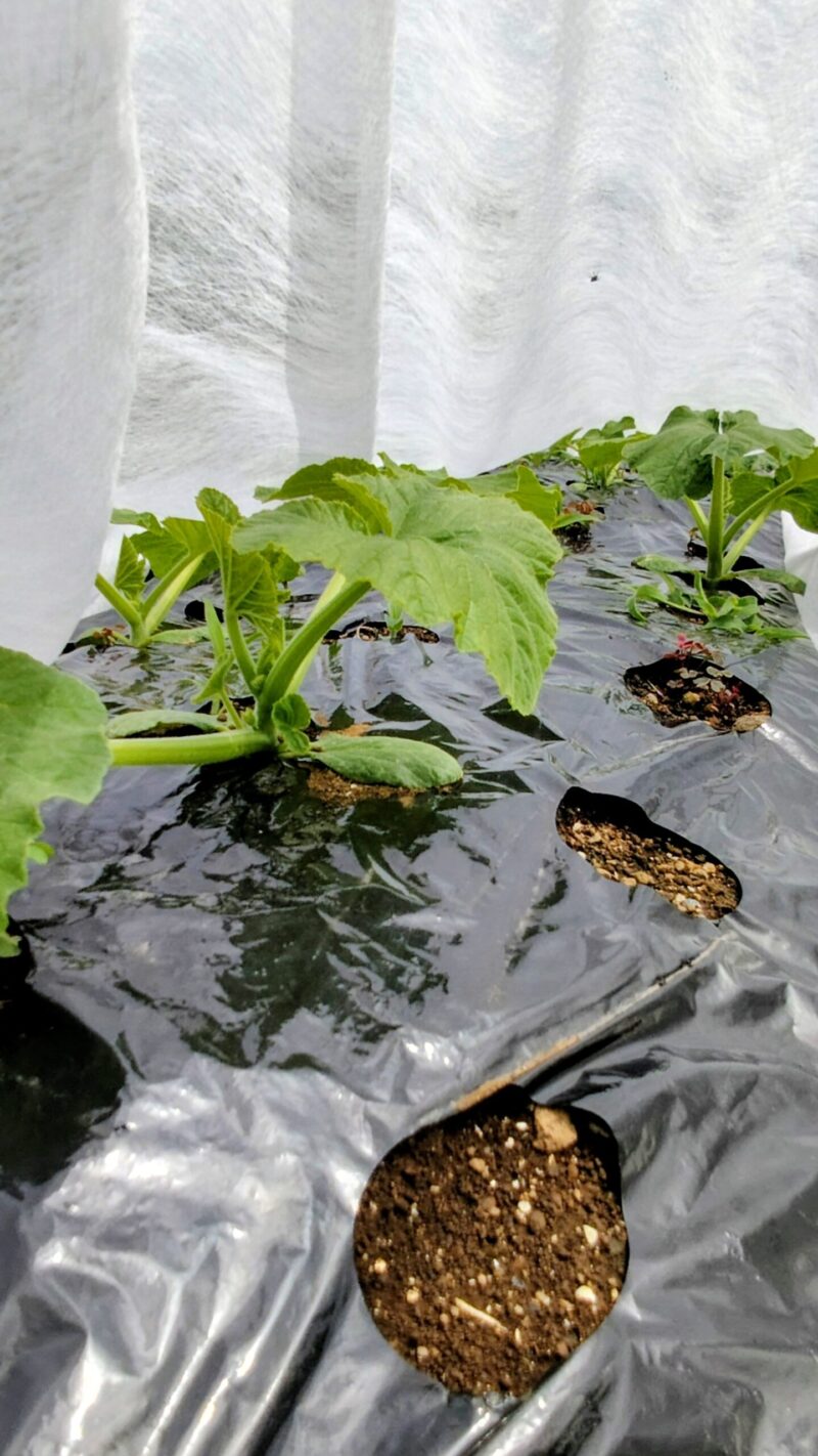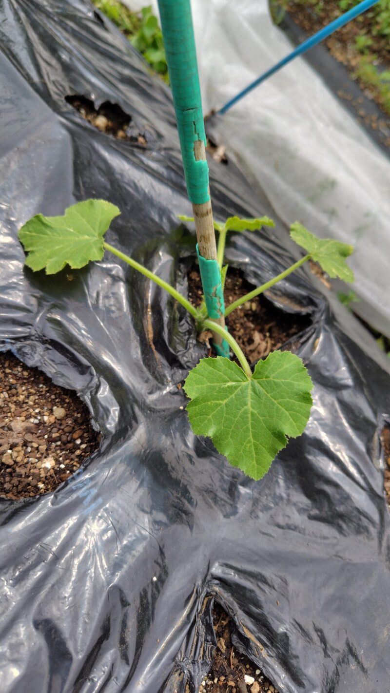 いろんな種類のズッキーニの葉っぱが大きくなってきています。これから急成長して花が咲いたら朝に咲いた雄花の花粉を、雌花の柱頭に受粉させておおきくするそうです。忙しそう。